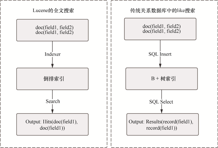 归根结底,Lucene 与传统关系数据库的差异来源于其索引结构。索引本身有很多类型,比如 B 树、哈希表、倒排索引。为了实现不同的目的,必须选择正确的索引。Lucene 选择倒排索引结构的主要目的就是支持快速高效的全文搜索。