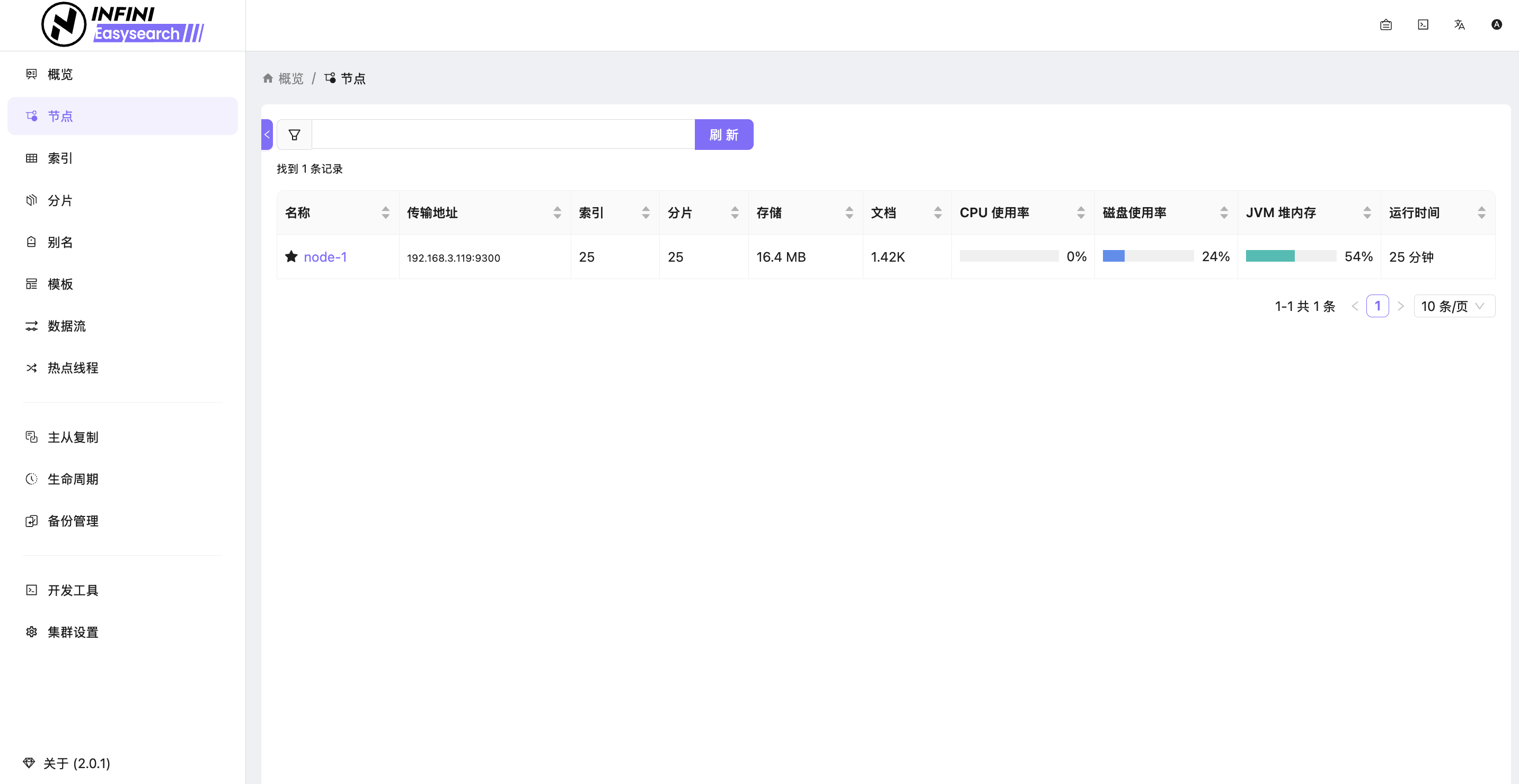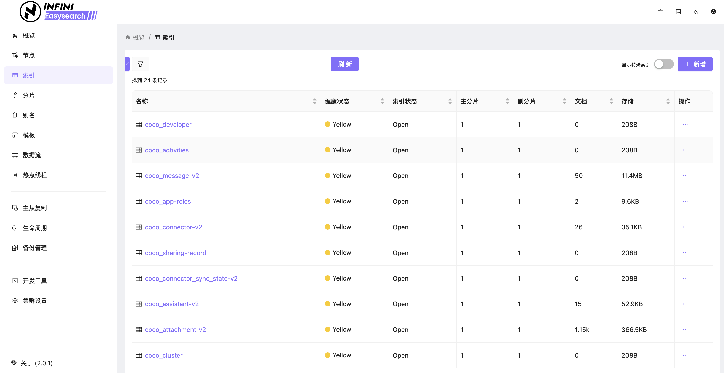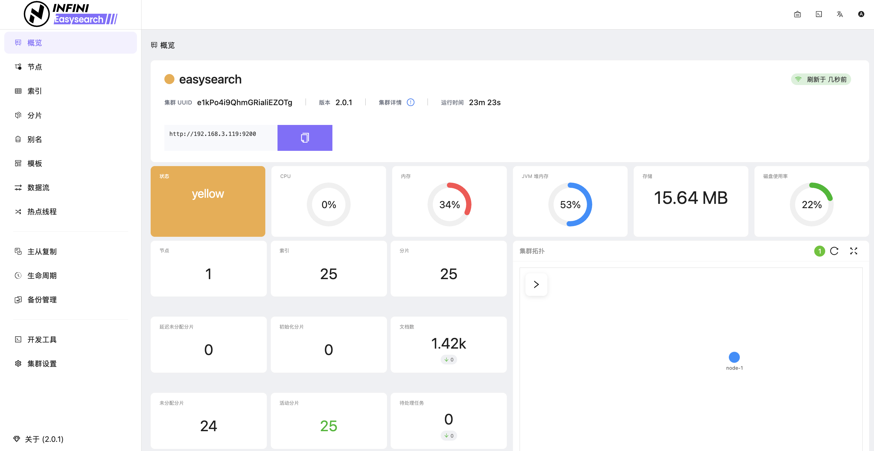 不像传统 ES 那样只能看到一行 status: yellow 的 JSON,Easysearch 的概览页直接用卡片式设计展示了核心指标: