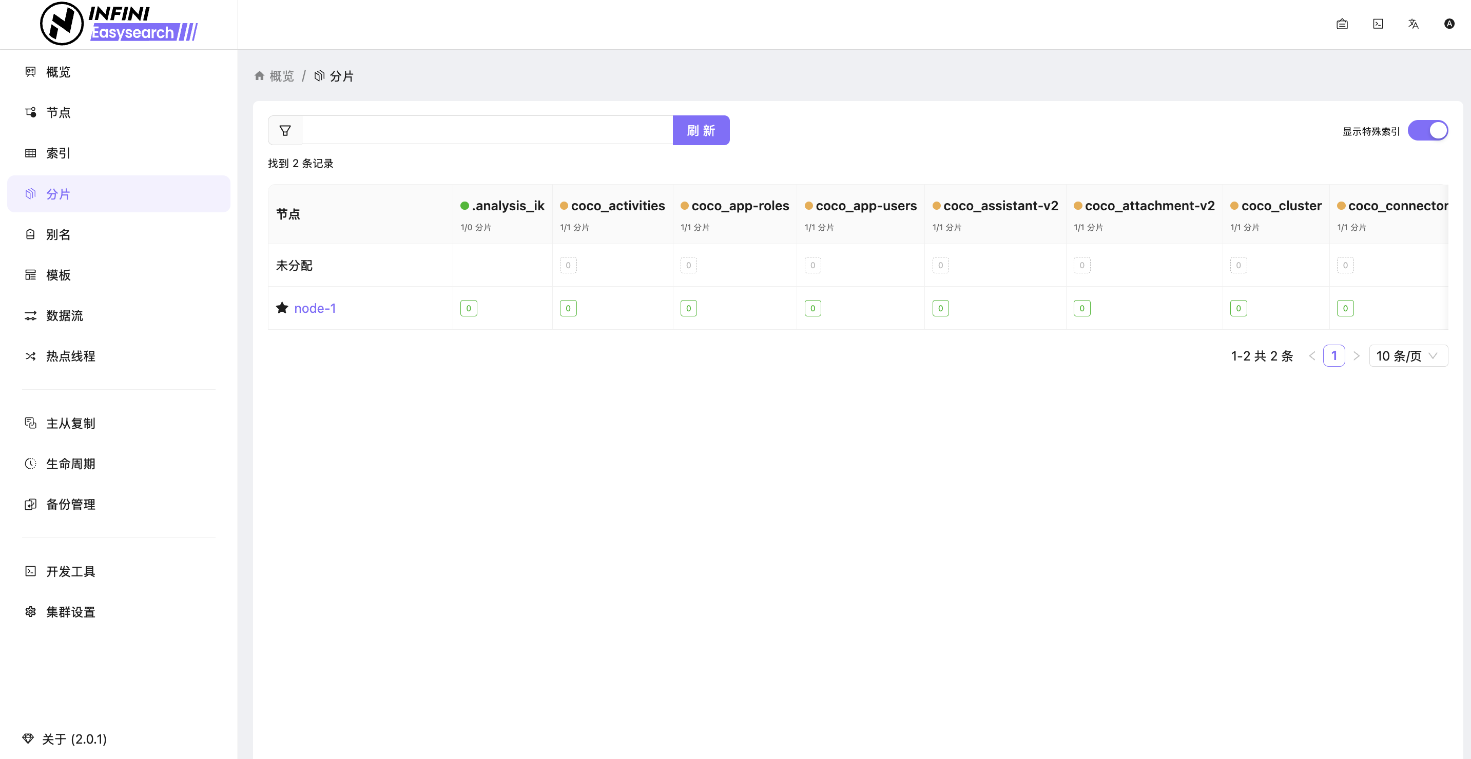 在原生 ES 中,想要理解“分片(Shard)”在物理机上是如何分布的,通常需要极强的空间想象力。而在 Easysearch 中,分片视图直接画给你看。你可以直观地看到主分片和副本分片是如何分布在不同节点上的,这在进行故障排查(如某个节点掉线导致分片未分配)时,效率提升了十倍不止。