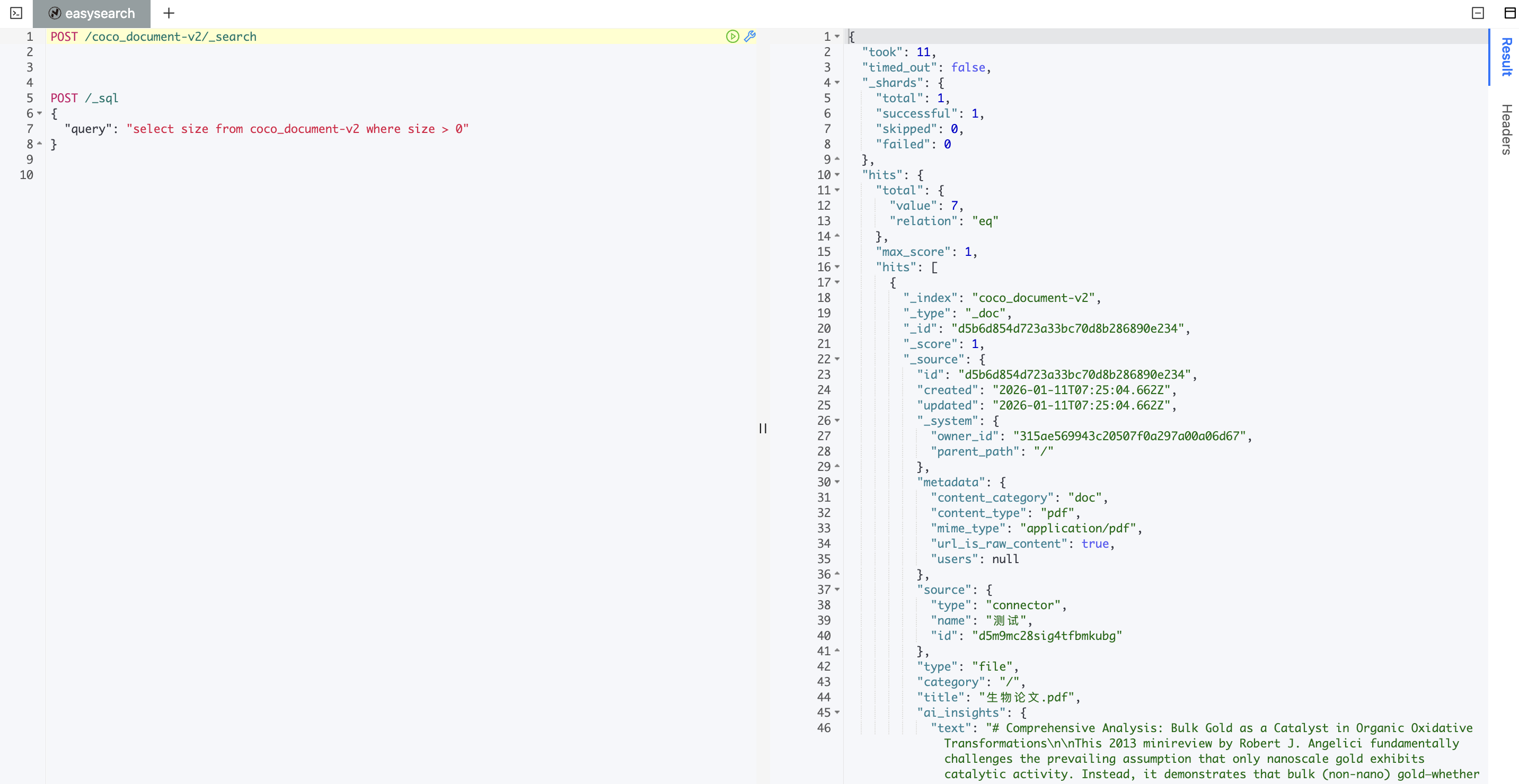 对于开发者而言,最常用的功能莫过于调试查询语句。Easysearch 直接内置了开发工具(Dev Tools),你再也不用去下载 Postman 或者 cURL 了。