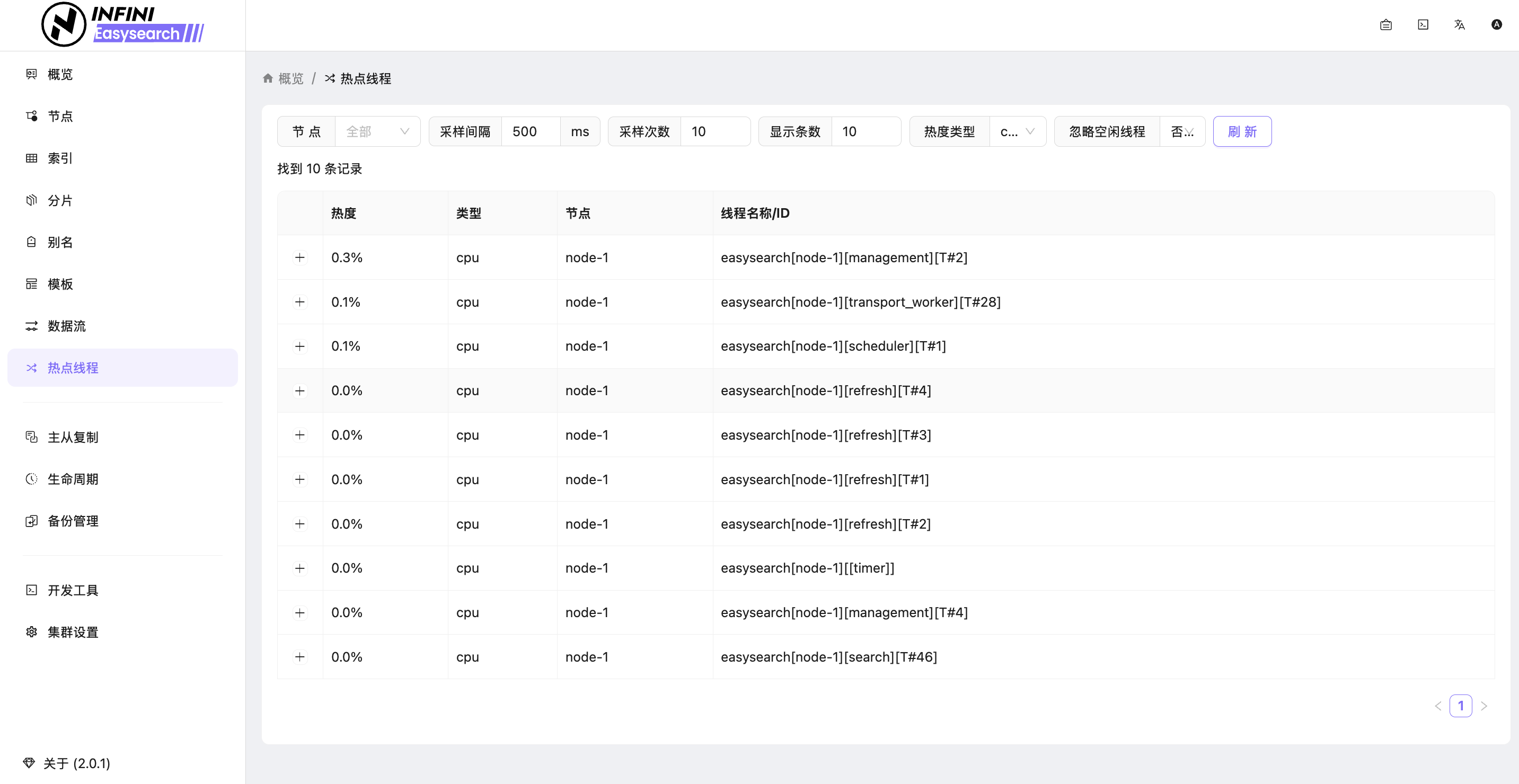 CPU 突然 100%?以前你需要抓堆栈日志分析。在 Easysearch 里,点击“热点线程”,系统会直接列出当前最消耗 CPU 的线程名称和操作类型。是谁在“捣乱”,一抓一个准。